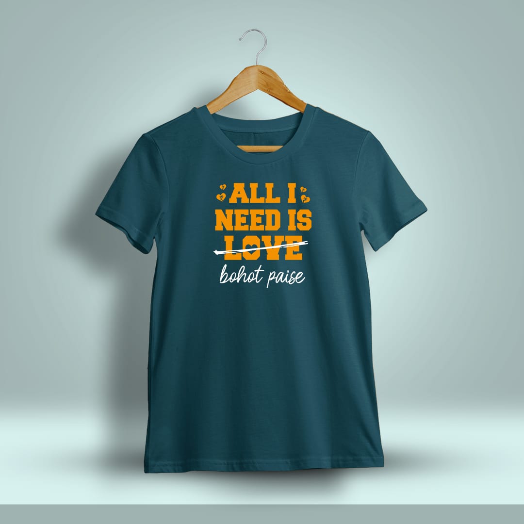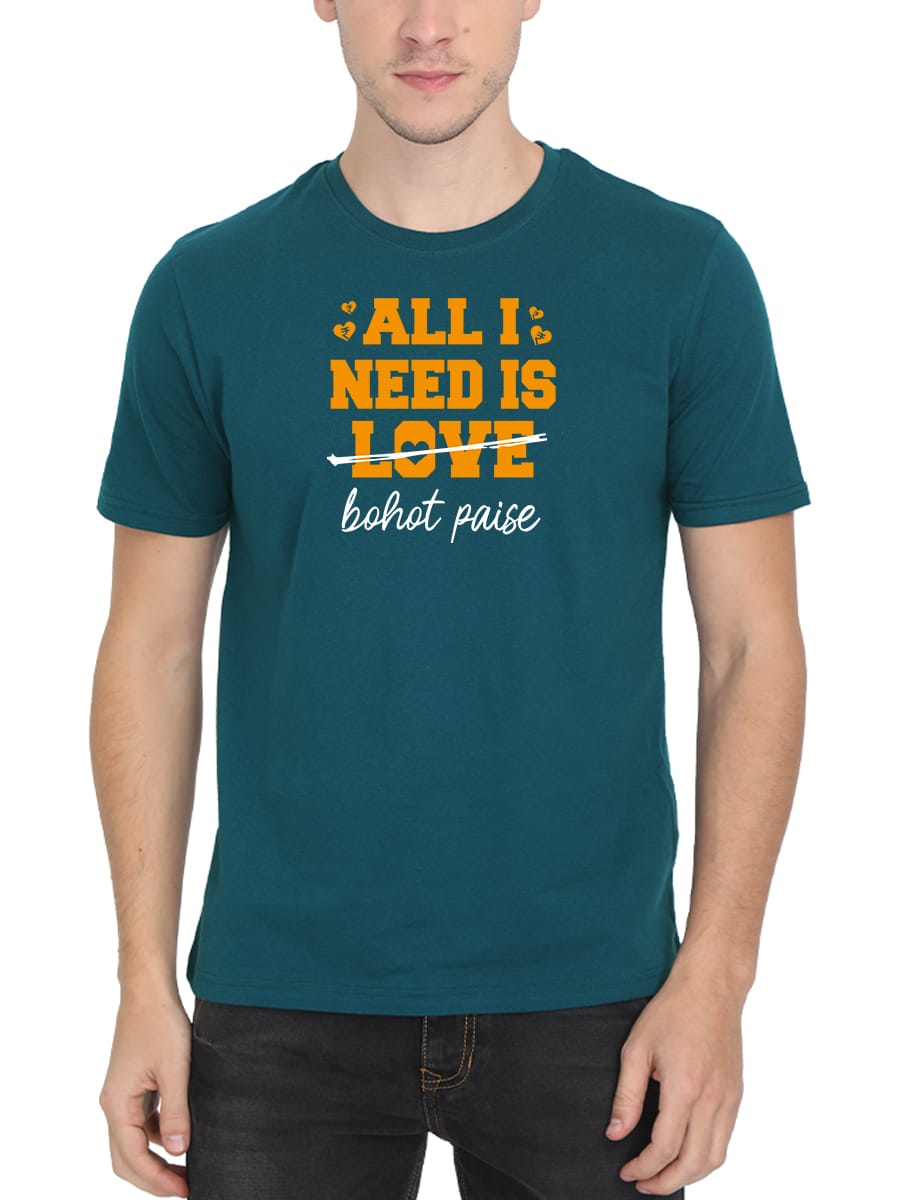 All I Need Is Love Bohot Paise Printed T-Shirt blends humor and reality in a stylish design, making it perfect for those who appreciate love and wealth equally.