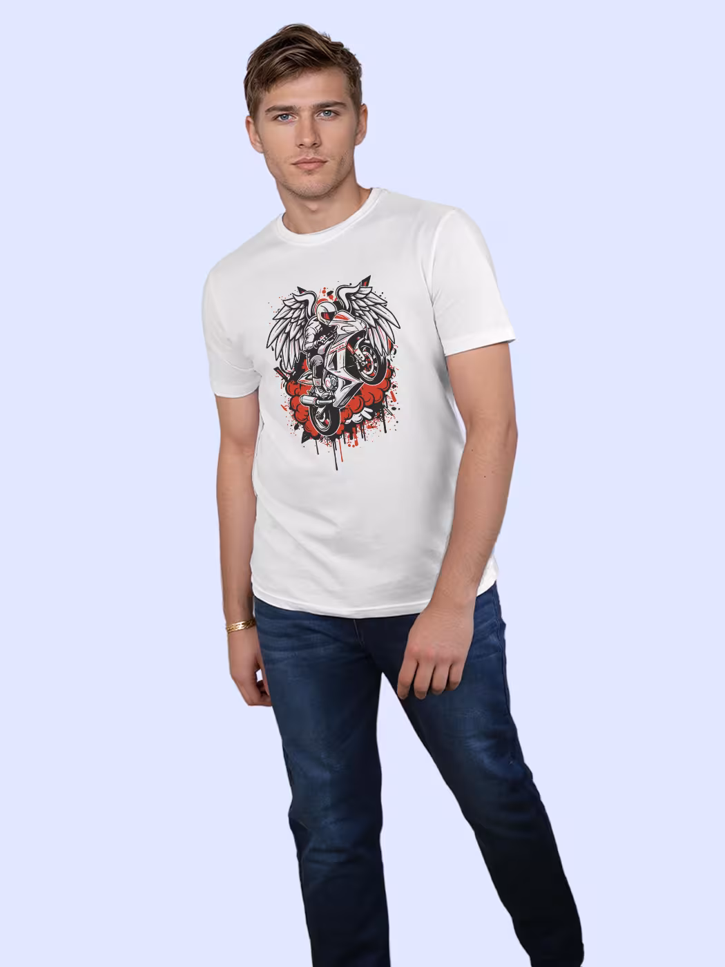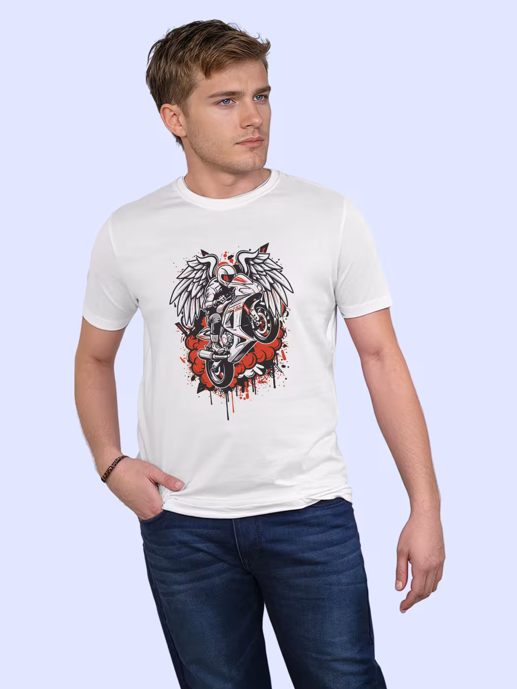 The Flying Biker T-Shirt For Men – Half Sleeve blends style and comfort with minimalist motorcycle-inspired graphics, soft cotton fabric, and a perfect fit for everyday rides or casual adventures.