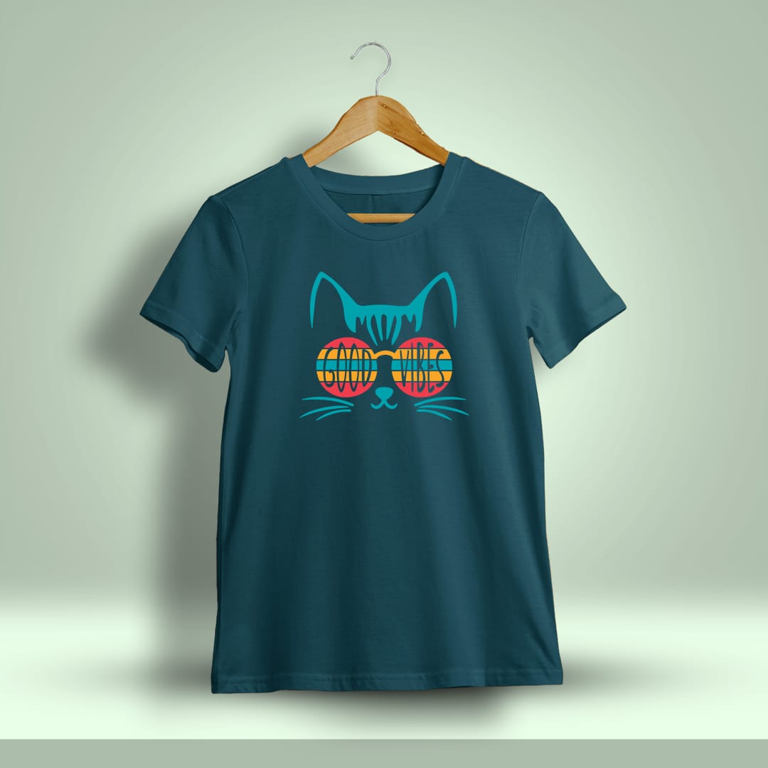 The Good Vibes Cat Graphic T-Shirt showcases a playful cat design spreading positivity, made with soft, breathable fabric for comfort and stylish casual wear.