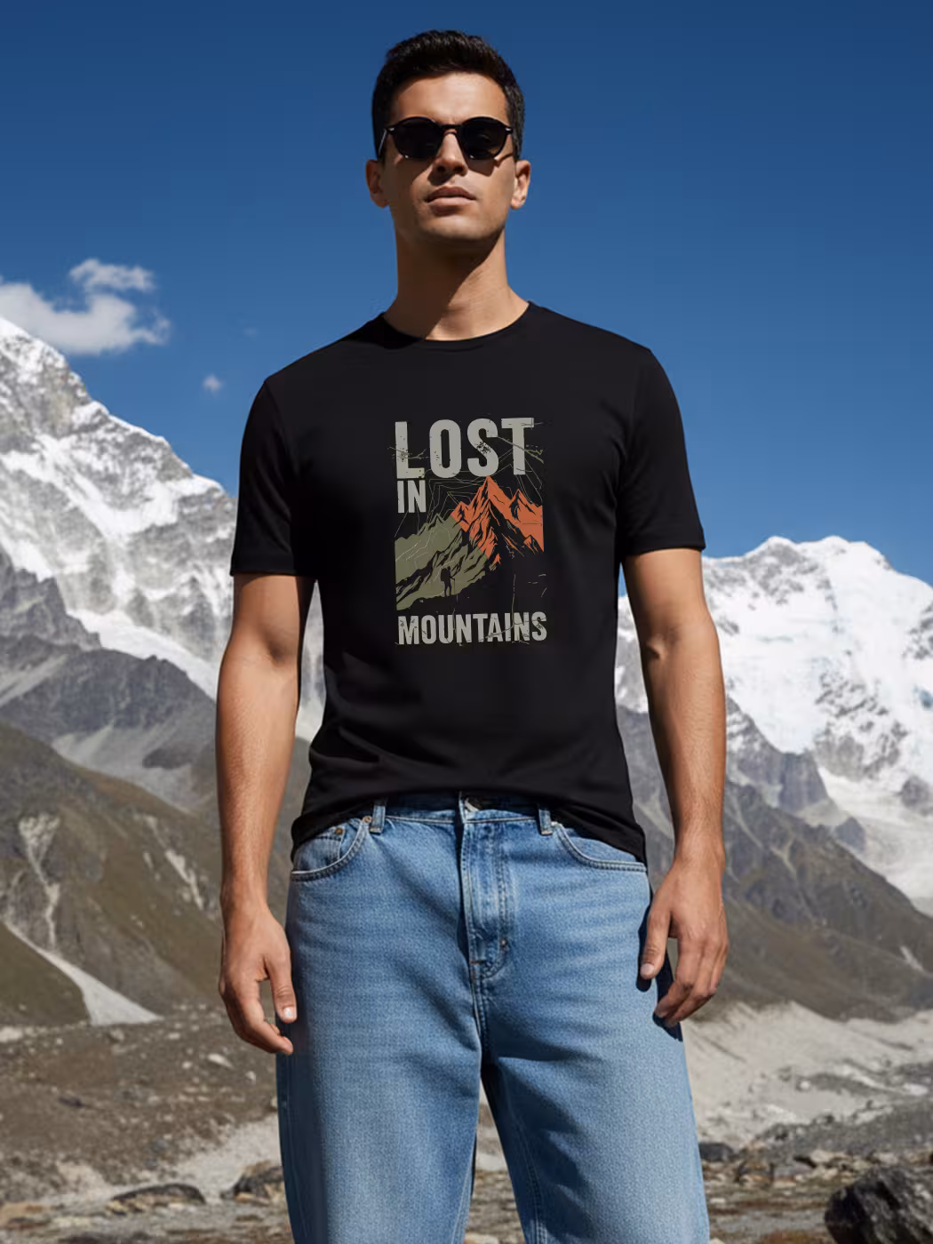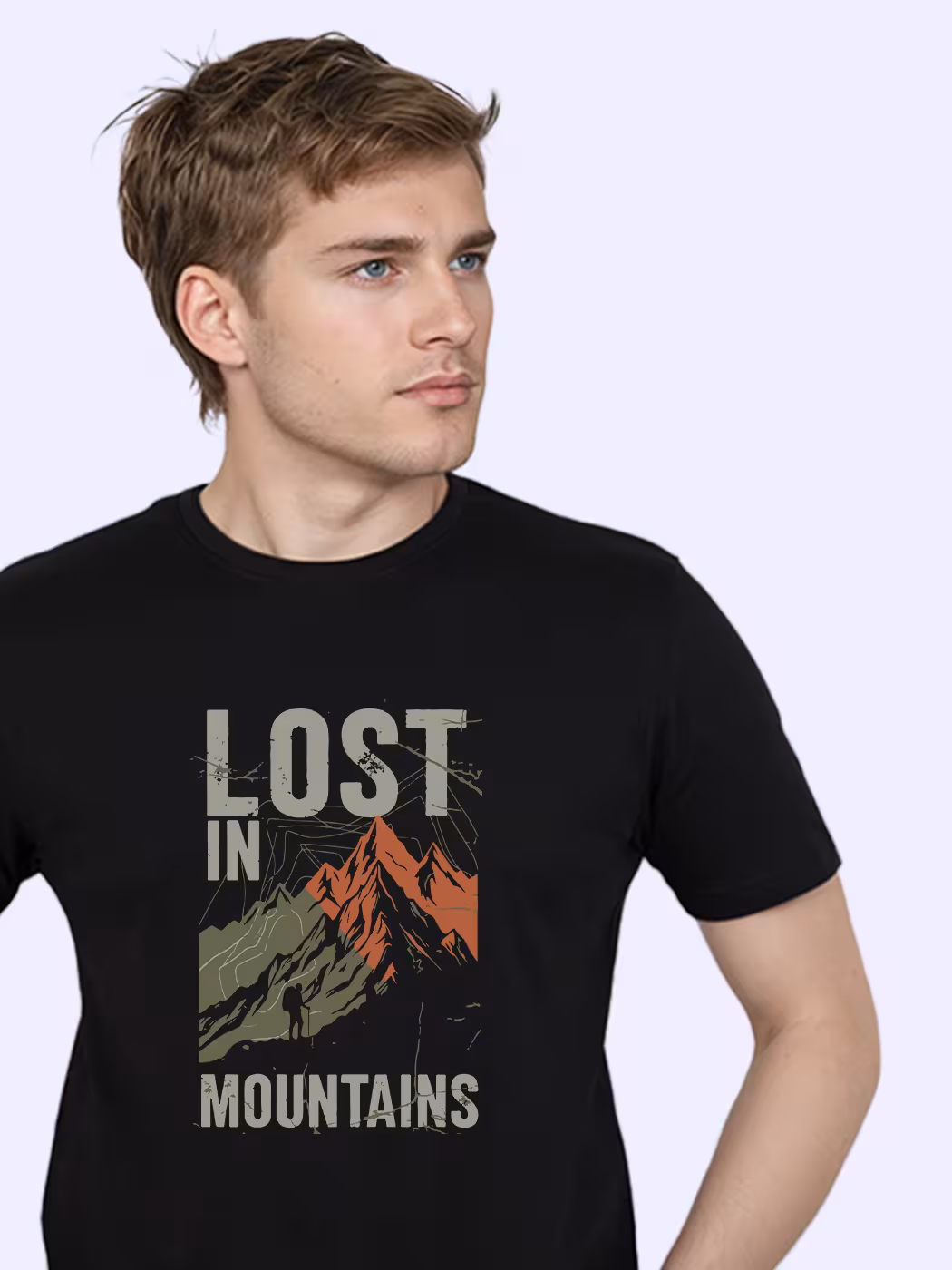 Find your calm with the Lost in Mountains T-shirt, half sleeves, soft cotton, crafted for mountain lovers who seek comfort and adventure together.