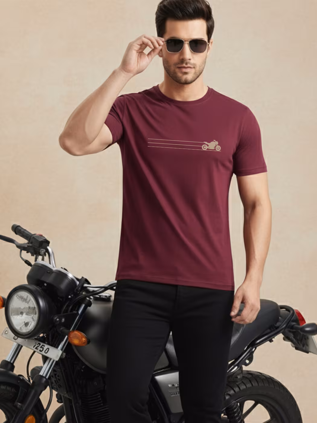 Minimal chest print motorcycle T-shirt, half sleeve, breathable cotton. Perfect blend of subtlety and biker identity, ensuring casual comfort with a stylish edge for everyday outfits.
