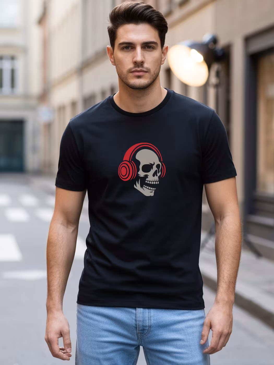 Music Skull Printed T-Shirt for men with half sleeves. Perfect blend of comfort and casual style. Ideal for everyday wear, parties, or gifting.
