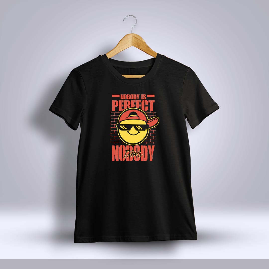 Nobody Is Perfect I Am Nobody Printed T-shirt embraces imperfections with humor, celebrating individuality and self-acceptance in a fun and stylish way for everyday wear.