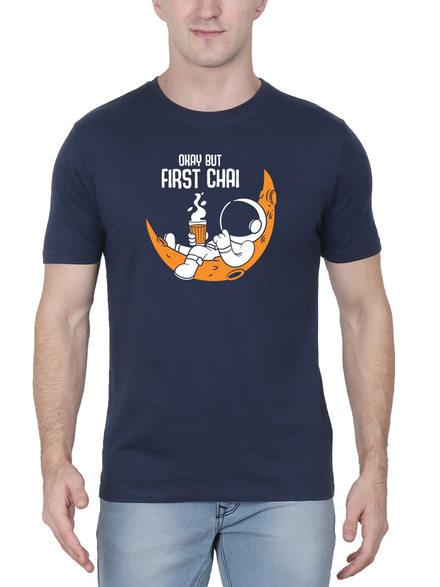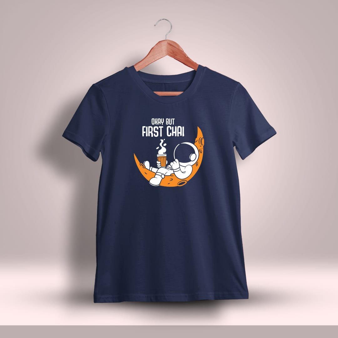 Okay But First Chai Printed T-Shirt is for chai lovers who prioritize their favorite brew above all else, featuring a fun and relatable design for tea enthusiasts.