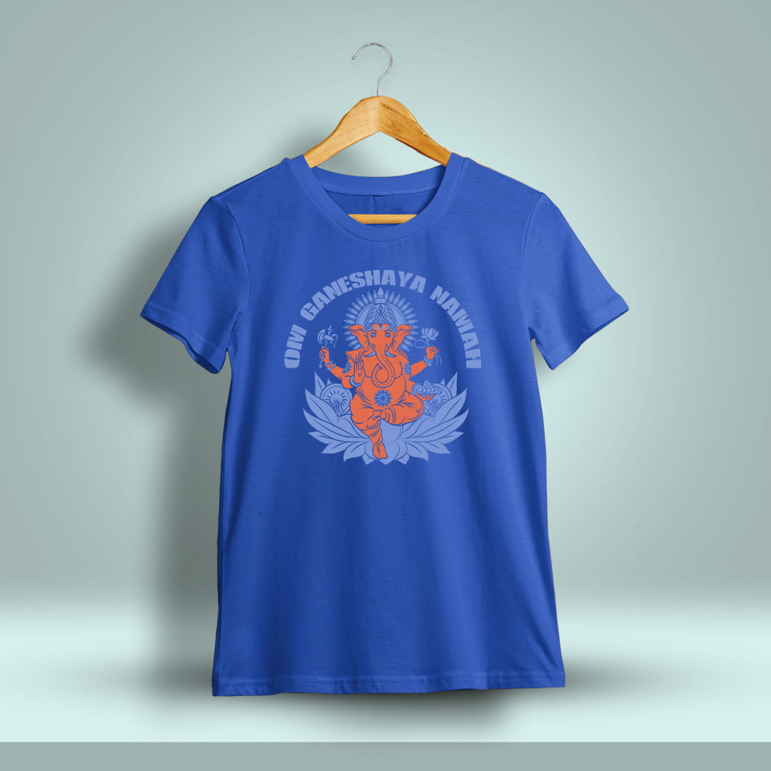 Om Ganeshaya Namah Ganpati T-Shirt features a divine design with a sacred mantra, blending spiritual reverence with everyday comfort for both casual and festive wear.