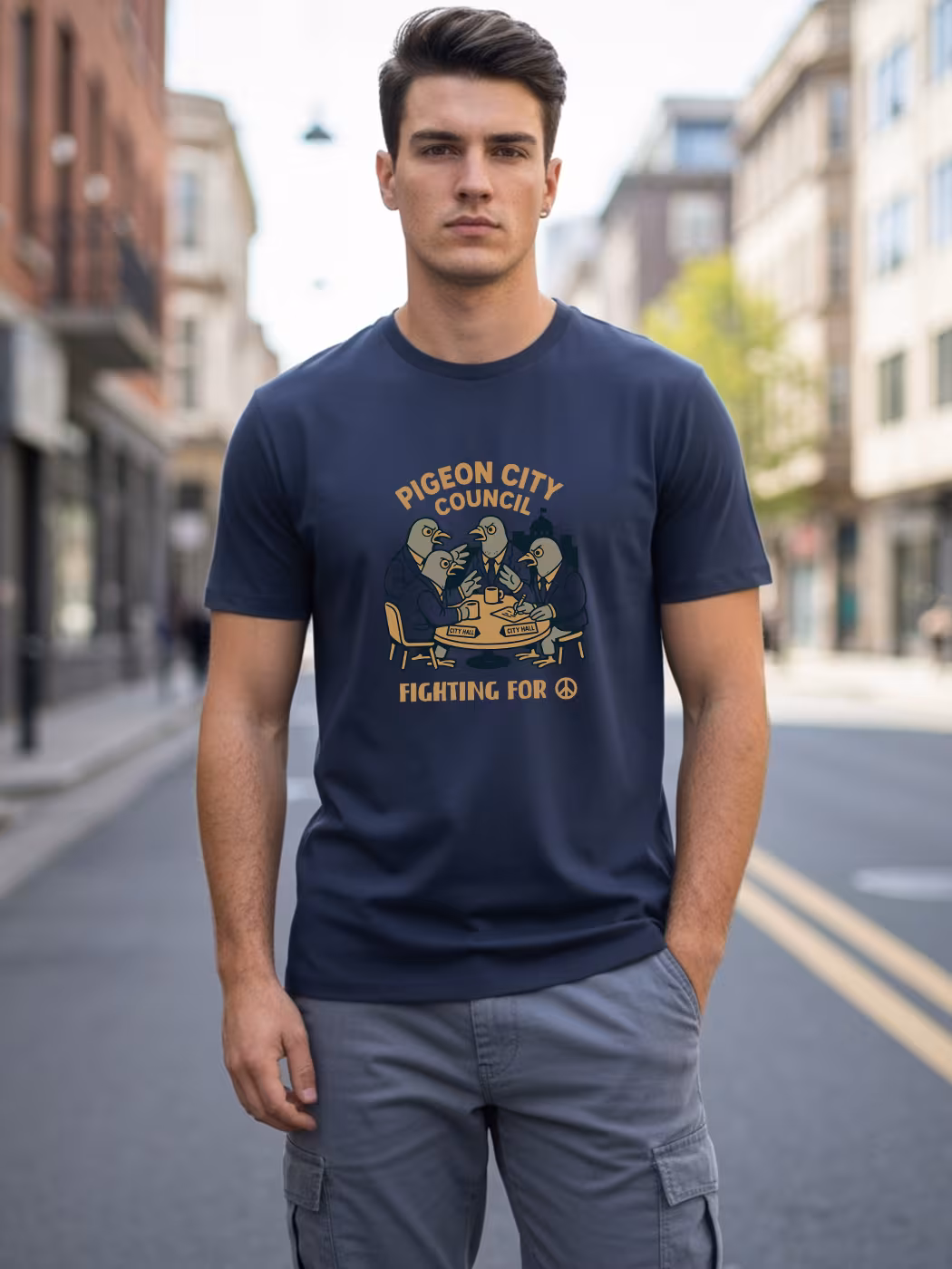 Urban street-culture half sleeve T-shirt for men with playful pigeon-inspired design.