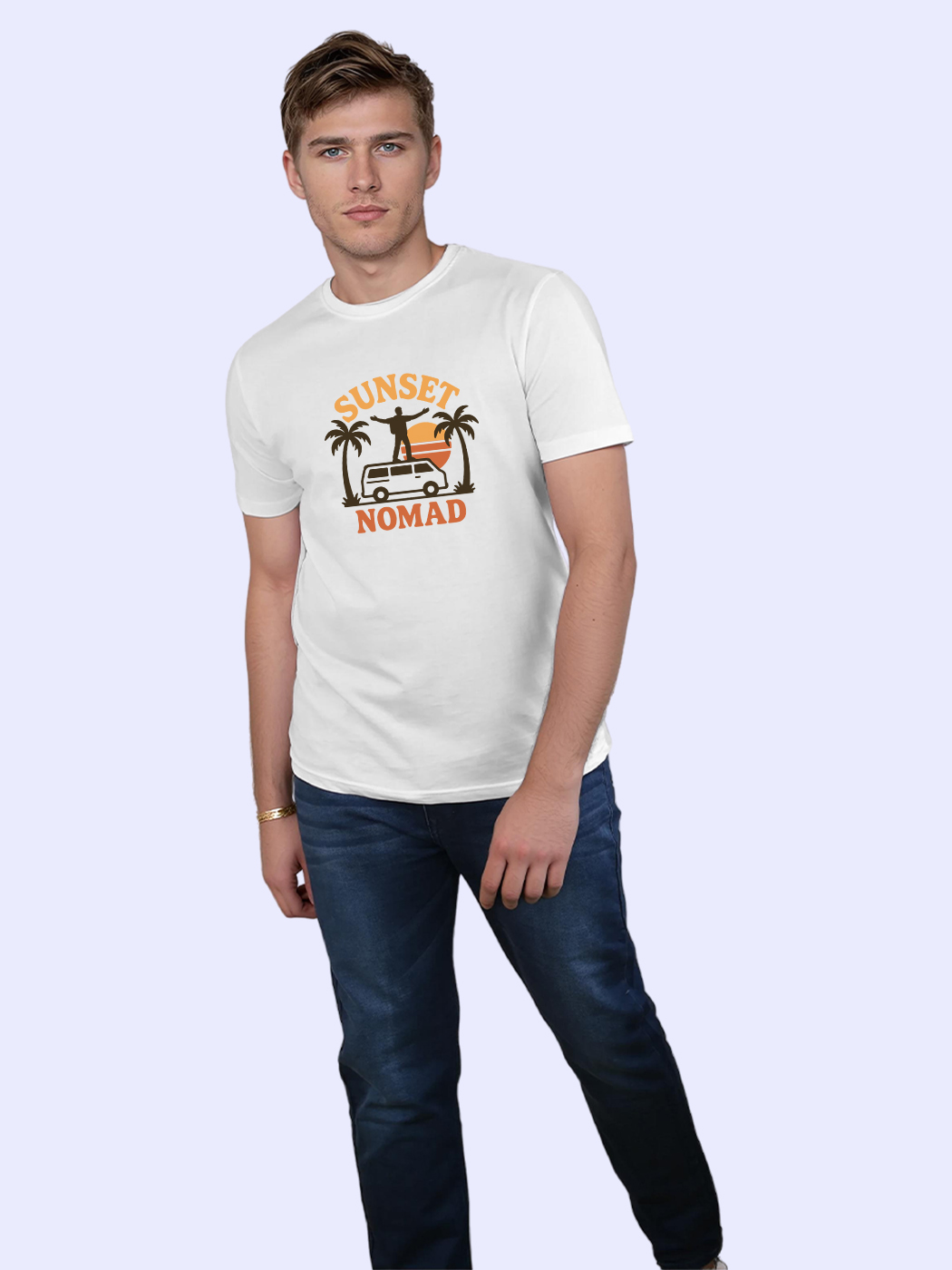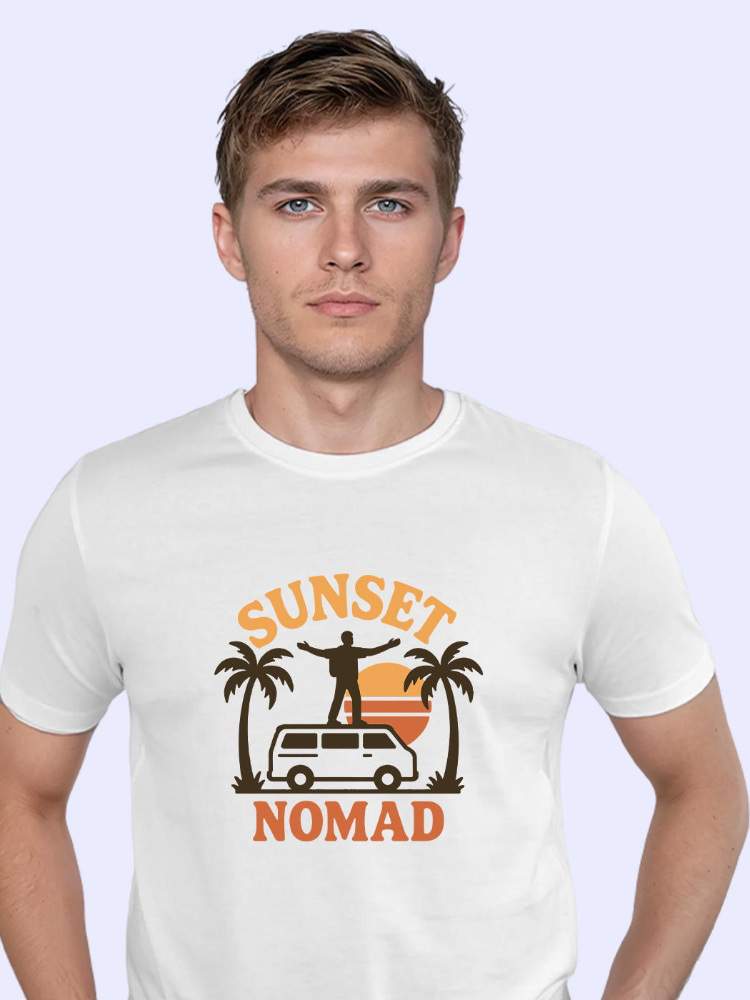 Sunset-inspired nomadic half sleeve T-shirt for men, perfect for beach trips and golden hour adventures.