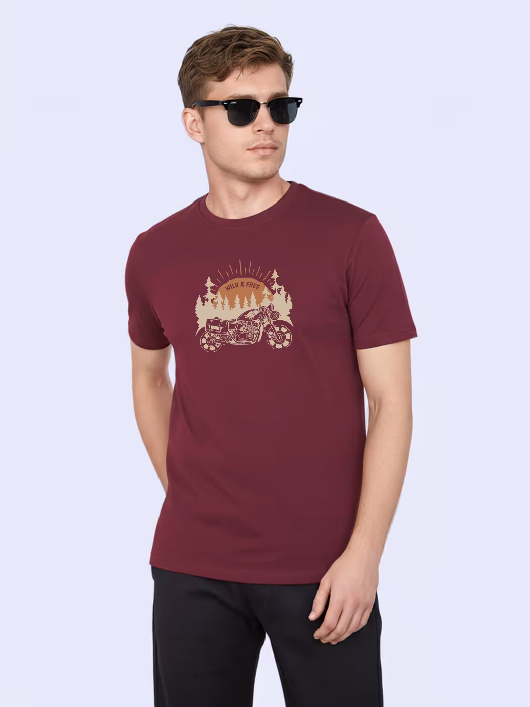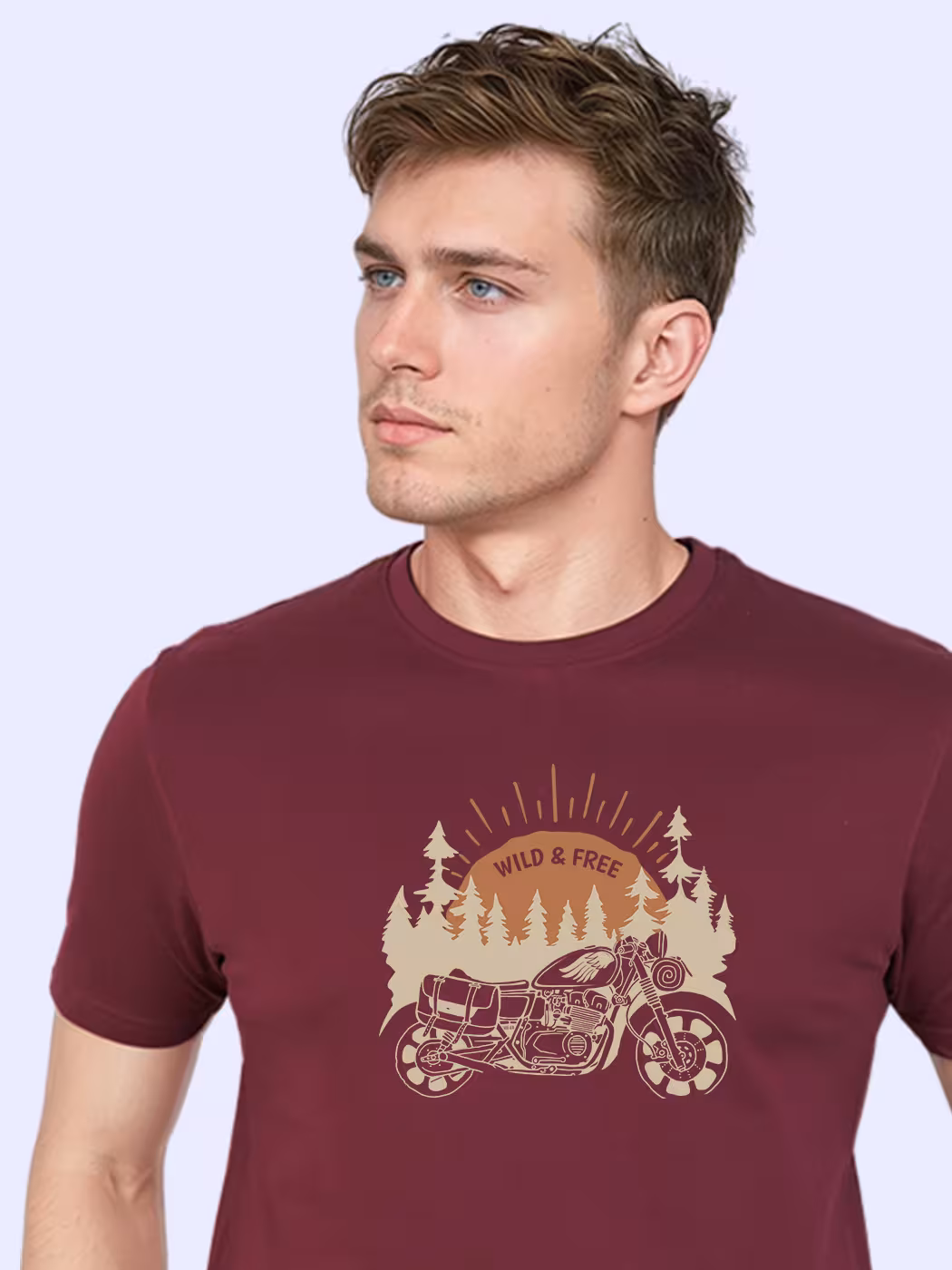 The Wild And Free T-Shirt For Men – Half Sleeve blends style and comfort with minimalist motorcycle-inspired graphics, soft cotton fabric, and a perfect fit for everyday rides or casual adventures.